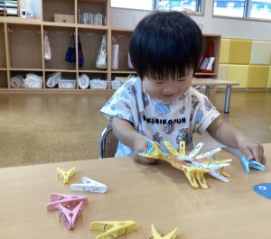 紐通しだけでなく、洗濯バサミで遊んだりもしています!