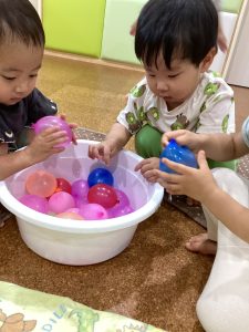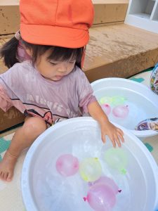 膨らむ前の水風船を見せると「これはなんだろう?」と不思議そうに見つめていましたが