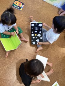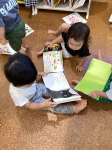 近くにいるお友達と一緒に同じ絵本を見る場面が👀✨
