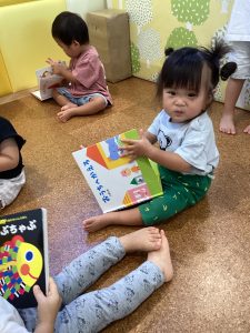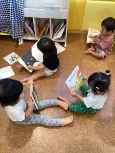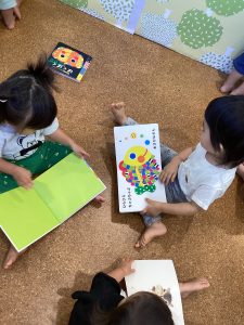 那珂園では保育室の中に絵本棚があり、好きな時に絵本を読む事ができるようになっています♡