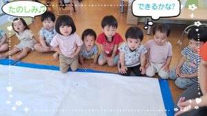 保育室に大きな白い画用紙を敷いているとみんな興味津々の様子で、キョロキョロ👀