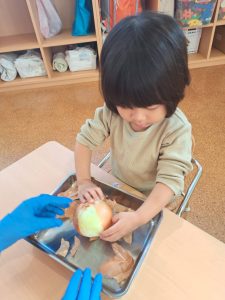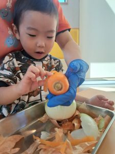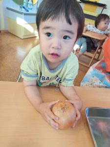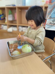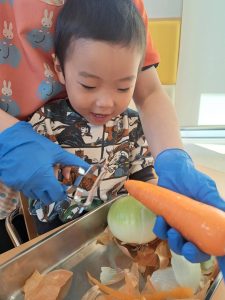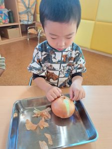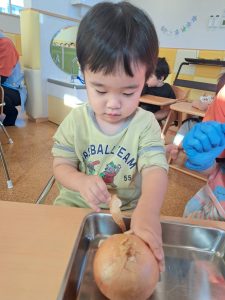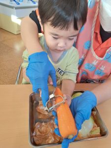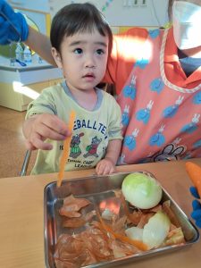 2歳児さんは、玉ねぎとにんじん皮剥き🥕