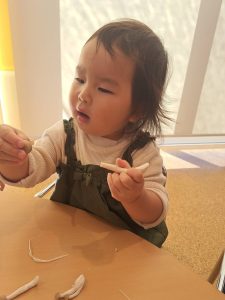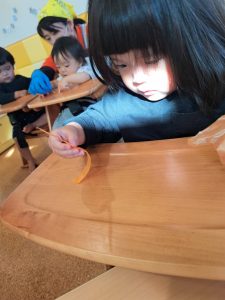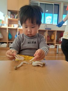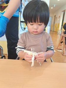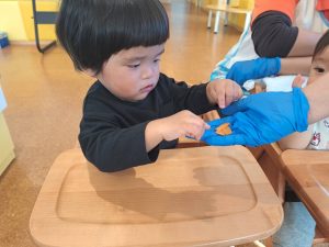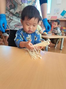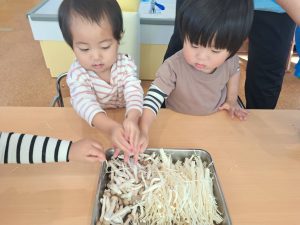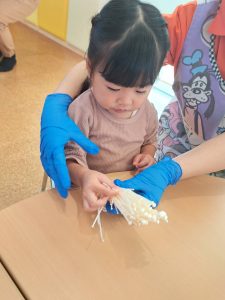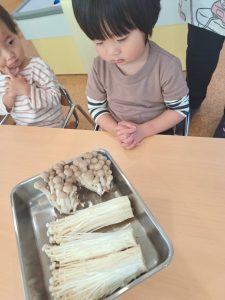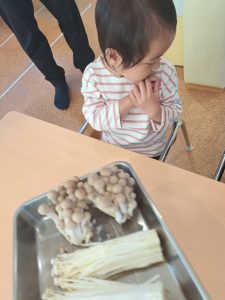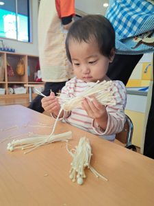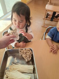 1歳児さんは、きのこ🍄を裂くお手伝いをしました!✨