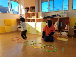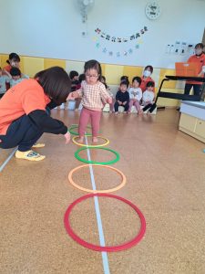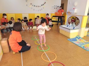 次は、フラフープを5つ並べ『ドレミファソ』のピアノに
