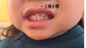 上の前歯の中央と上唇を繋ぐひだ(上唇小帯)に歯ブラシが