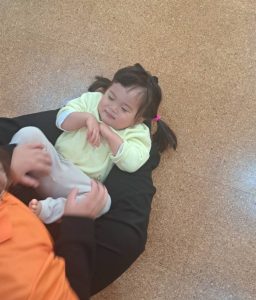 まずは、お子さんを保護者の方の足と足の間に寝かせます。