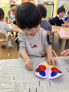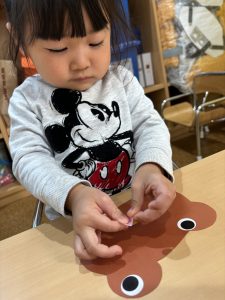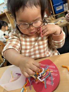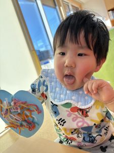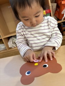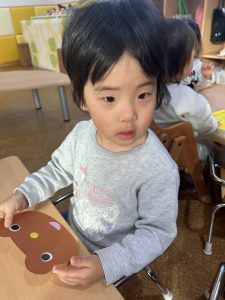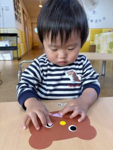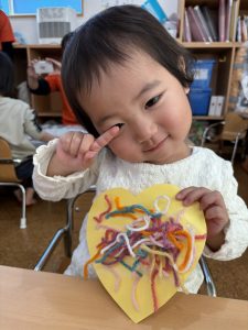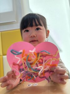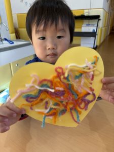 1歳児さんは、クマさんのハートを色とりどりの毛糸で