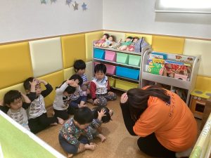 「頭を押さえ小さくなーれ!」と動物さん達に教えてもらい、