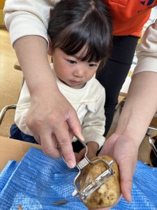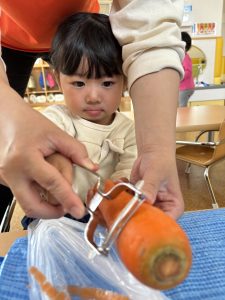 2歳児さんのみで行ったのですが、みんな初めての皮剥きに興味津々の様子で