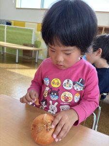 ピーっと皮が剥けると満面の笑みで保育者を見ていました♪