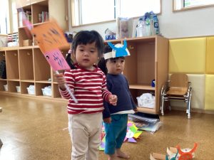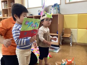嬉しそうにこいのぼりを持ち、お友達に見せていました☺️
