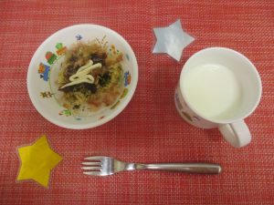 今日は、ポテトサラダが美味しかったようで大人気でした。甘辛い味のついた豚のしょうが焼きとご飯は食が進み、おかわりする子も多かったです。今日もたくさん食べました♡