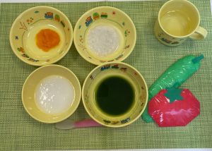 (写真は離乳食後期です。年齢によって形、固さ、盛り付け量を変えて、提供しています。)