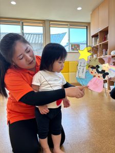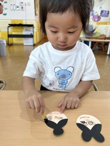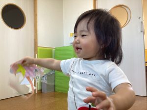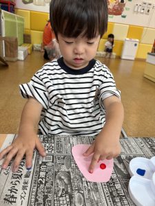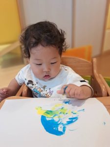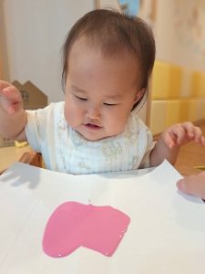 絵の具遊びが好きなもも組さんは、にこにこ笑顔で
