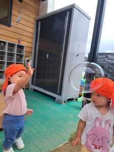 晴れた日に園庭へ出てシャボン玉遊びを
