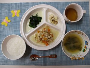 (写真は離乳食後期です。年齢によって形、固さ、盛り付け量を変えて、提供しています。)