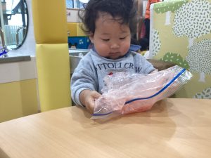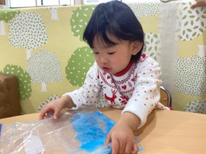 0歳児では、感触遊び【スライム】を行いました!