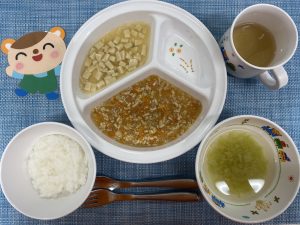 粥 わかめスープ 鶏ひき肉と野菜のくず煮 豆腐の煮物
