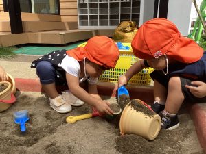 砂場では、アイス屋さんごっこをしたり、自分のカップにたくさんの砂を入れて保育者に「見てー」と見せてくれるお友達❤️