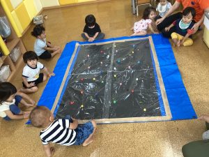 大きな模造紙の上でポンポンに触れると色が出てきて、お友達はビックリ😆