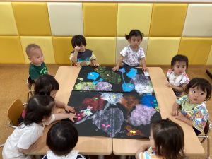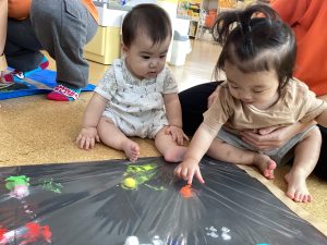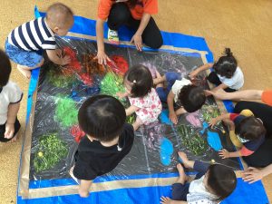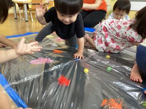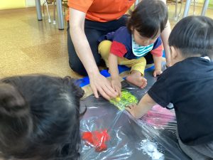 手芸で使用するポンポンに絵の具🎨を付けて、密閉された袋にそのポンポンを入れて、その上からお友達みんなで手や足を使って色付けしていきました🎶