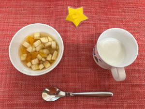 (写真は後期食です。月齢によって形、固さ、盛り付け量を変えて提供しています。)