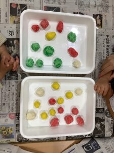 小麦粉粘土の感触を楽しみながら、先生と一緒に粘土を丸めていきました。