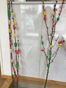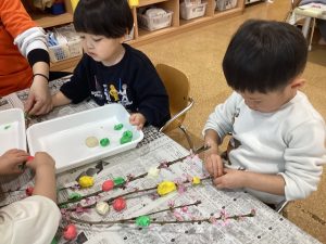 丸めた花もちを、桃の花の枝につけていきましたよ。