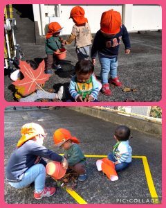 砂場遊びのバケツを用意すると、夢中になって落ち葉を集めるお友だちもいました
