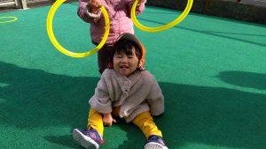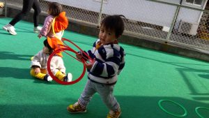 輪をくぐるためには小さくならなくちゃと一生懸命身体を小さくさせながら輪をくぐる子どもたち![]()