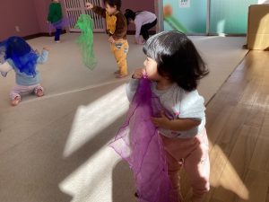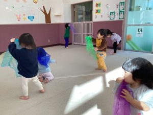 スカーフ遊びでは、新しい動きで「まわす」という動きが加わりました