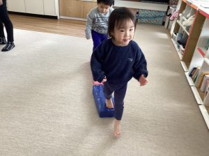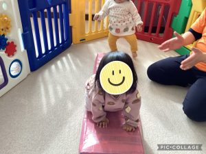 マット運動では、保育士とマットの上でゴロゴロと寝返りをうったり、