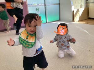 0歳児のお友達は大きいお姉さんお兄さんを見ながら、