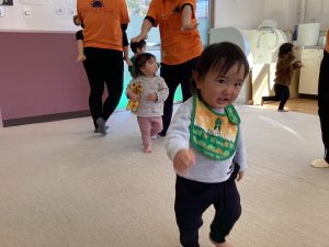 0歳児のお友達は大きいお姉さんお兄さんを見ながら、