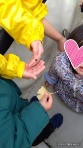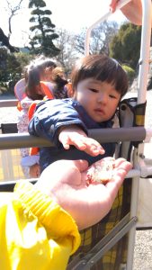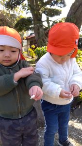 1.2歳児クラスのお友だちは「梅の花びらが落ちているね」 などと話しながら花びらを拾ったり…![]()