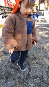 お散歩で境内を訪れると、春一番に吹かれて落ちてしまった花びら達を見つけ、