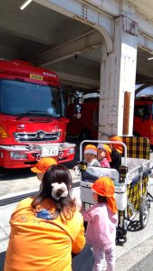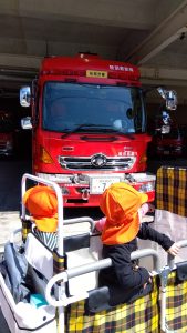 消防署の前まで行くと、消防車を見て大興奮の子どもたち