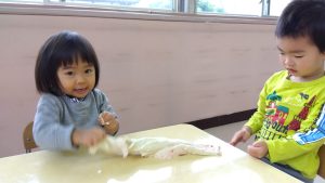 小麦粉粘土で、お友だちとひっぱりっこ!!