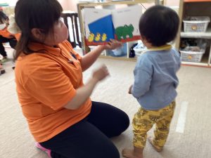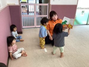 お友だちに声をかけて遊びやお散歩に誘うことを、絵本を通してなのはな保育園の子どもたちは学ぶことができました