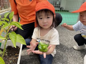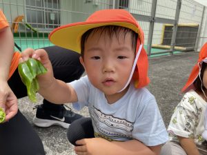 帰ってきてから園で栽培しているかわいらしいピーマンを収穫しました