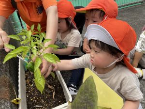 匂いをかいだり、にぎったり、ちぎったりしてピーマンとふれあいました
