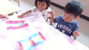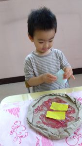 ビー玉ころがしで模様付けした画用紙にシールを貼ってもらいました![]()