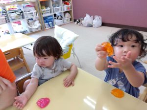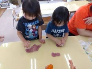 りんご組さんはというと、いちご組のお友だちと一緒にジェル粘土を楽しんでいましたよ