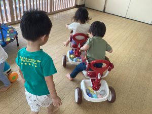 まだ乗れないお友だちは、ドライブスルーのように三輪車のカゴにボールを入れてくれてみんなで楽しみました