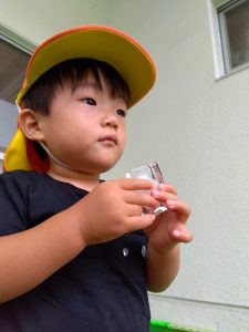 少しの時間園庭に出て過ごしてみると、霧吹きで手を濡らしてあげるとにこっと笑顔が見られます ![]()
