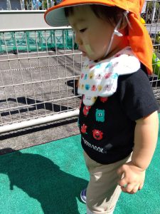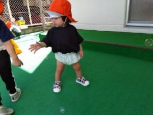 少しの時間園庭に出て過ごしてみると、霧吹きで手を濡らしてあげるとにこっと笑顔が見られます ![]()