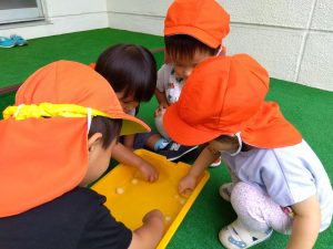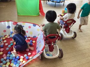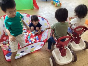 まだ乗れないお友だちは、ドライブスルーのように三輪車のカゴにボールを入れてくれてみんなで楽しみました