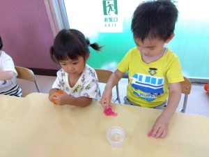 りんご組さんはというと、いちご組のお友だちと一緒にジェル粘土を楽しんでいましたよ