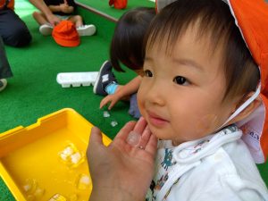 いちご組さんは、園庭に出て氷触れて遊びました