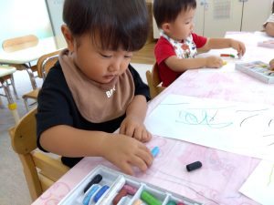 子どもたちはお絵描きも大好きで、「お絵描きする人〜」と声をかけると「はぁーい」と可愛らしい声が聞こえてきますよ